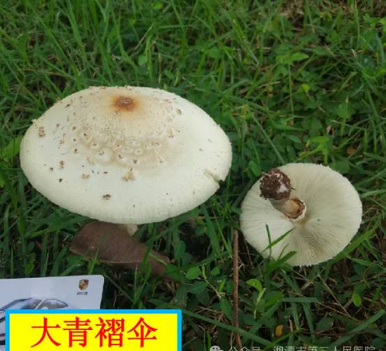 大青褶伞一年四季均有分布,常生长于公园或小区草坪上,菜地里,路边草地、荒地,锯末堆及垃圾堆旁,是离人群最近的毒蘑菇,也是造成中毒事件最多、最常见的蘑菇之一。其形态特点为个头较大,帽子(菌盖)是白色的,帽子中间凸起且呈暗褐色,然后逐渐分裂变成鳞片。误食会引起严重的胃肠道症状,包括恶心、呕吐、腹痛、腹泻等,严重中毒可以导致多器官功能衰竭。